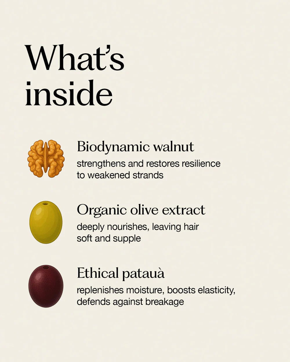A deeply nourishing mask designed for very dry, dehydrated, or thick, frizzy hair, enriched with biodynamic walnut and olive extract to restore hydration, softness, and resilience. Ethical patauá oil replenishes moisture, enhances elasticity, and helps prevent split ends, leaving hair visibly healthier, bouncier, and more resistant to dryness. Infused with warm notes of vanilla, cinnamon, and orange for a rich, sensual experience.